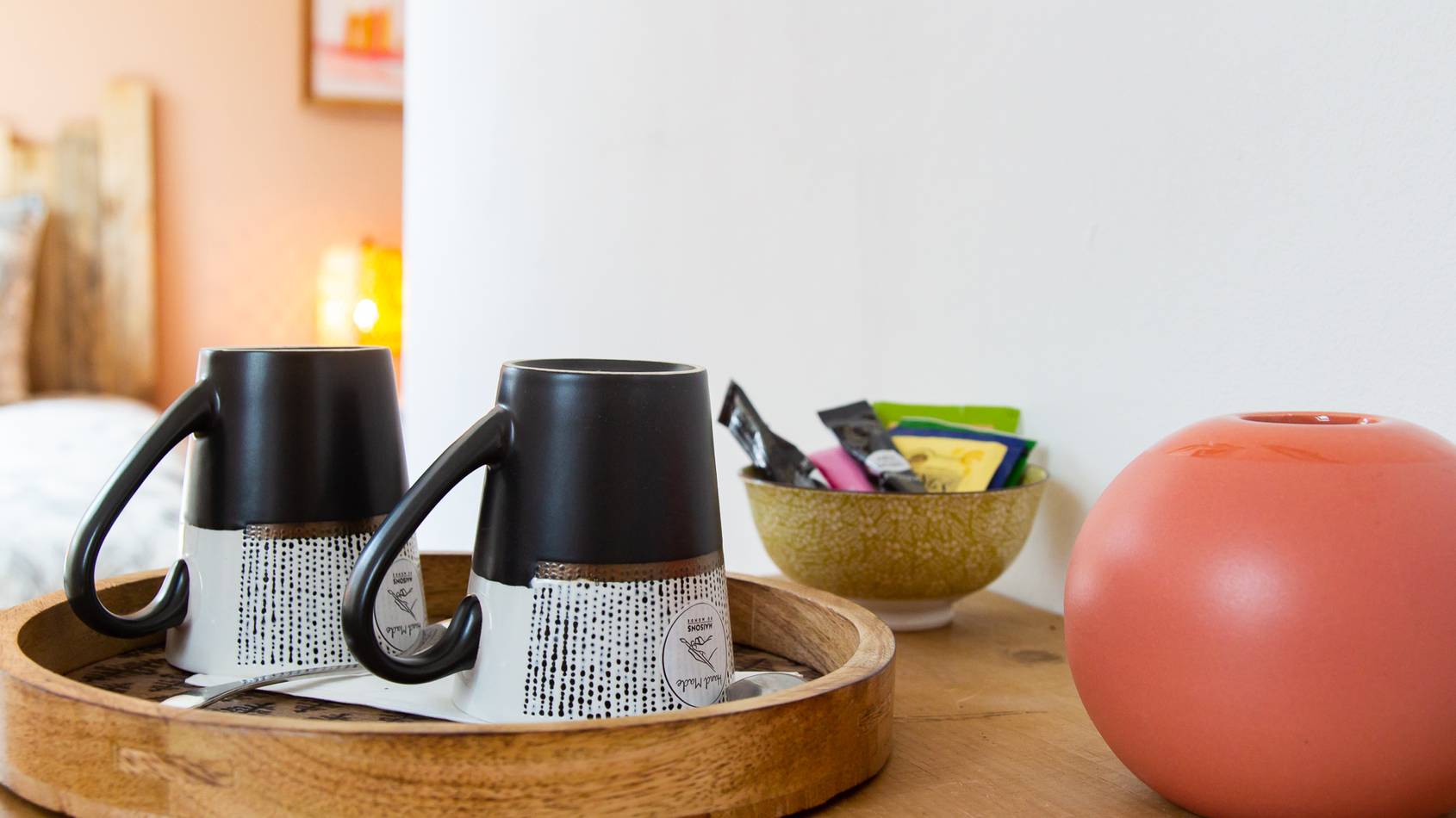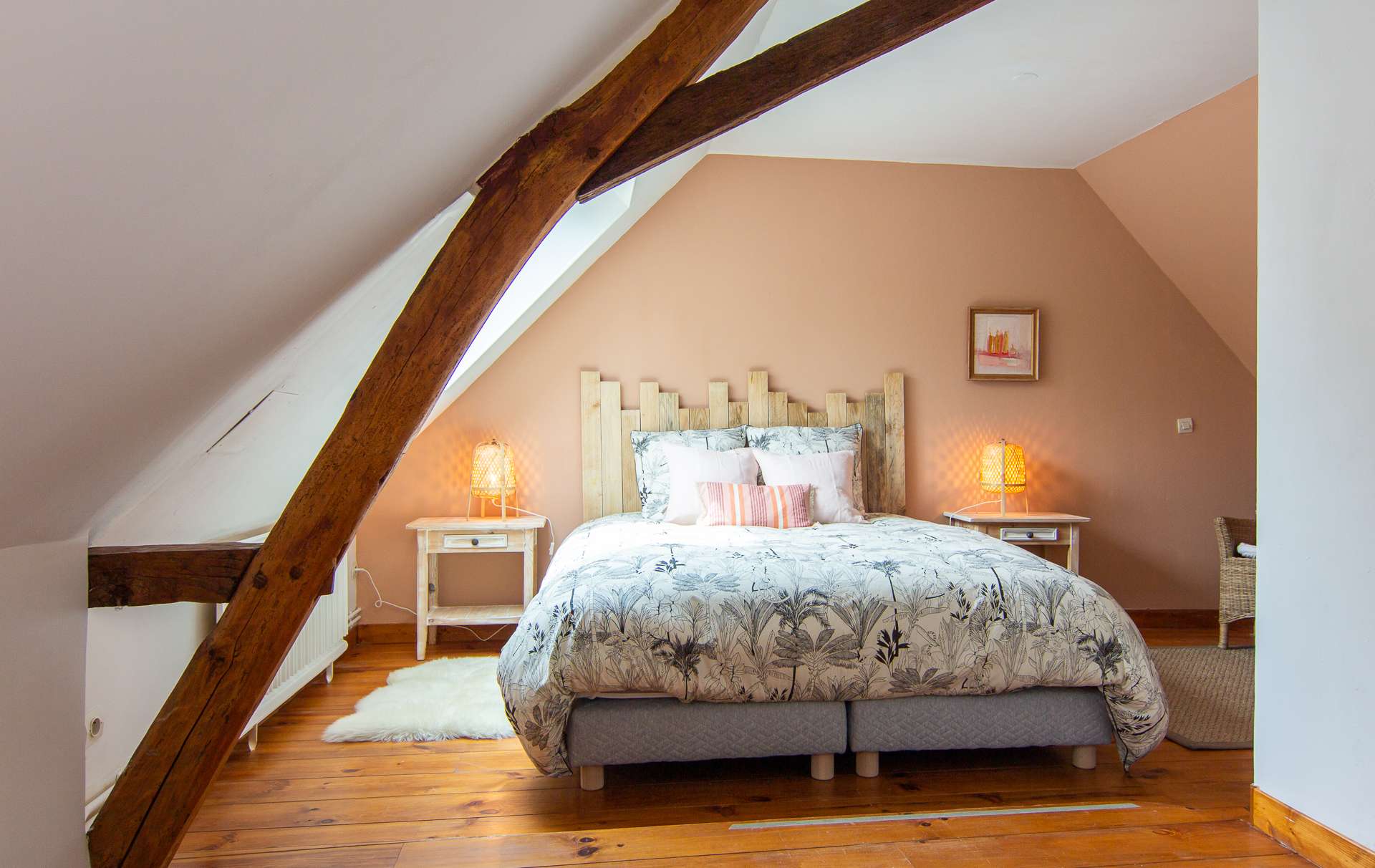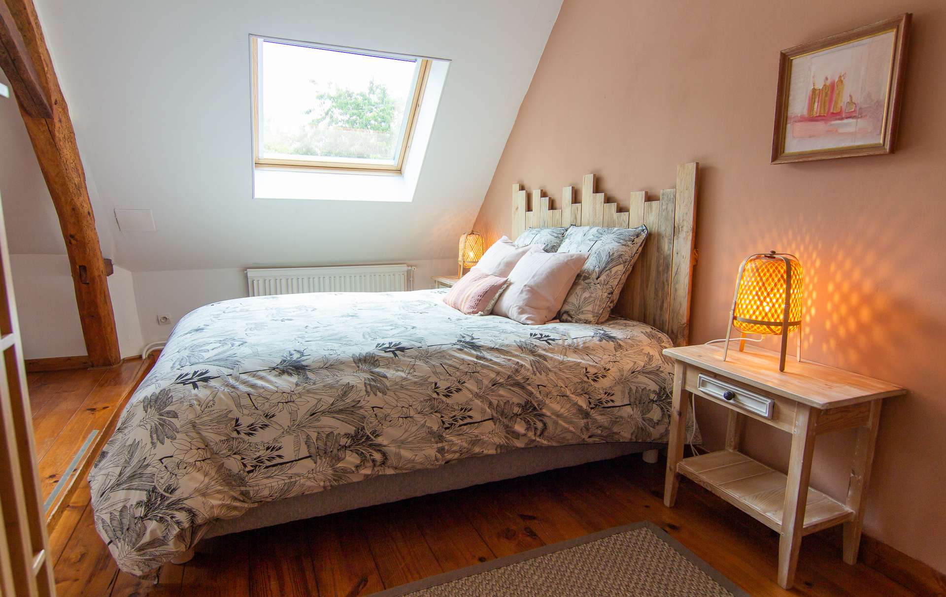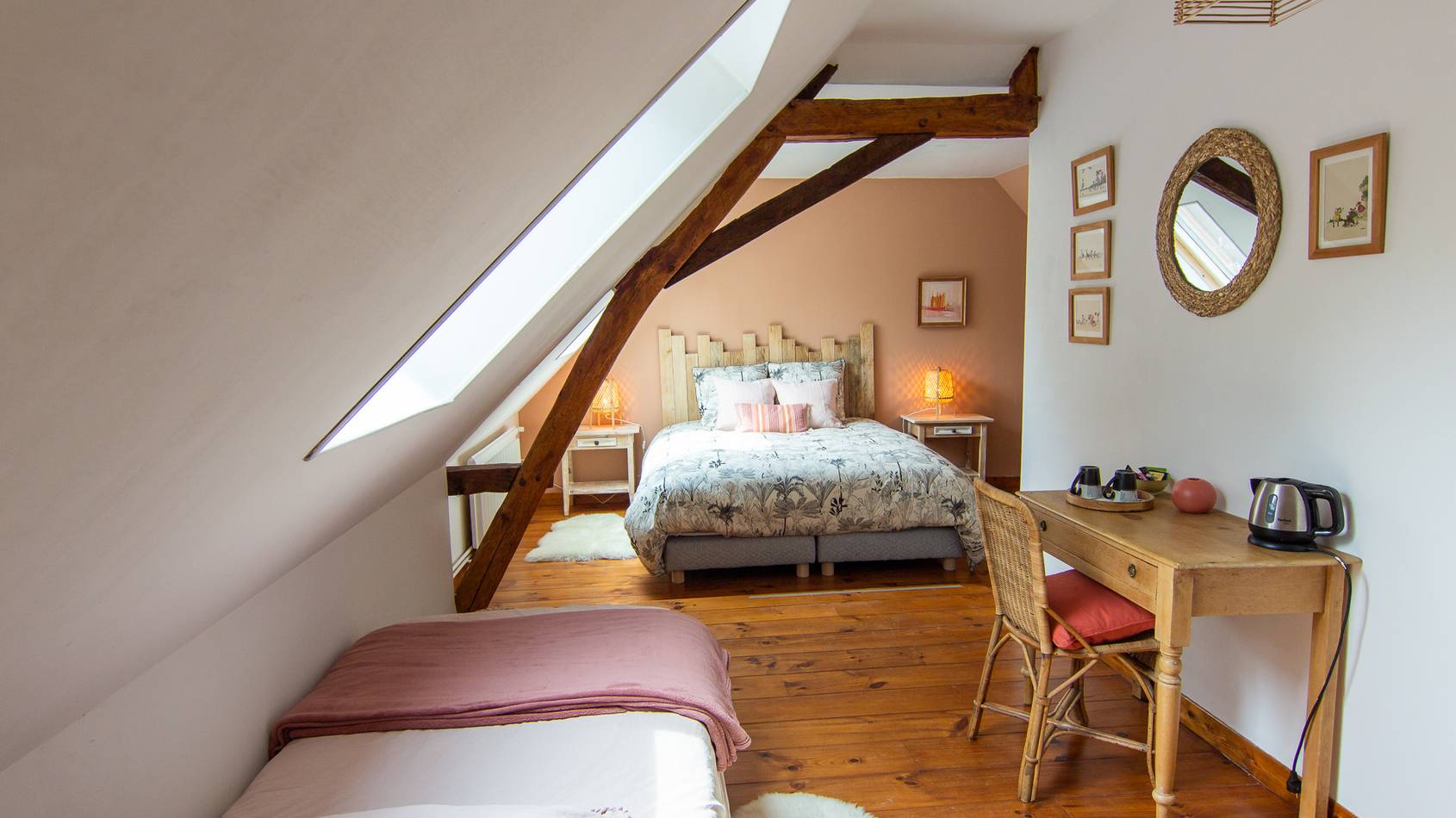 Elle est équipée d’un lit en 160×200 et d’un lit supplémentaire en 80×190 cm. Cette chambre parentale vous charmera par la douceur de sa couleur terracotta et de son mobilier très actuel en rotin et osier.